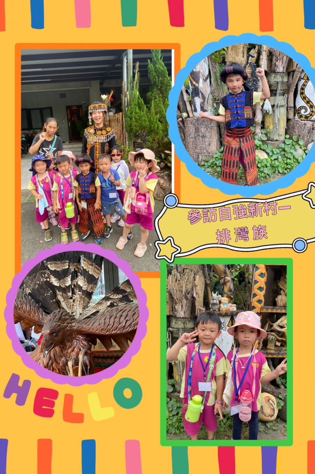 帶領企鵝🐧班寶貝們參訪自強新村,認識了排灣族原住民的文化特色,除了認識百步蛇🐍的代表圖騰,還體驗了三寶之一的琉璃珠項鍊、排灣族服飾、以及代表友誼的雙連杯,孩子們學會尊重不同族群,樂於參與多元文化的活動。